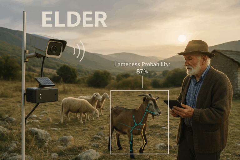 ELDER delivers an Edge-AI system for real-time detection of lameness in ruminants. It leverages RGB-D cameras and on-device inference and monitors animal movement without wearables or cloud dependency, making it ideal for remote and rugged farm environments. ELDER analyses gait patterns and delivers lameness alerts through a web interface and empowers farmers to intervene early, improving animal welfare and reducing economic loss.